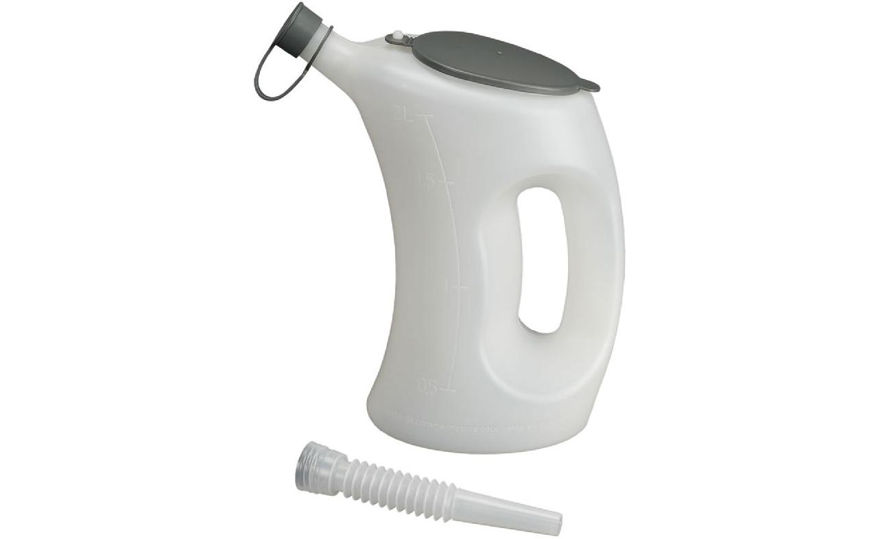 Avec couvercle et capuchon de protection. Bec en forme d'entonnoir. Bec flexible inclus. En polyéthylène incassable, avec graduation. Résistant à l'huile, à l'acide et au carburant.